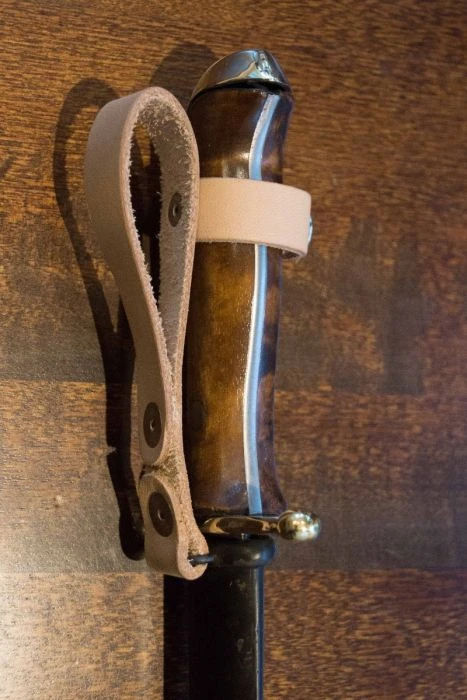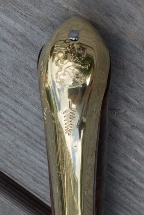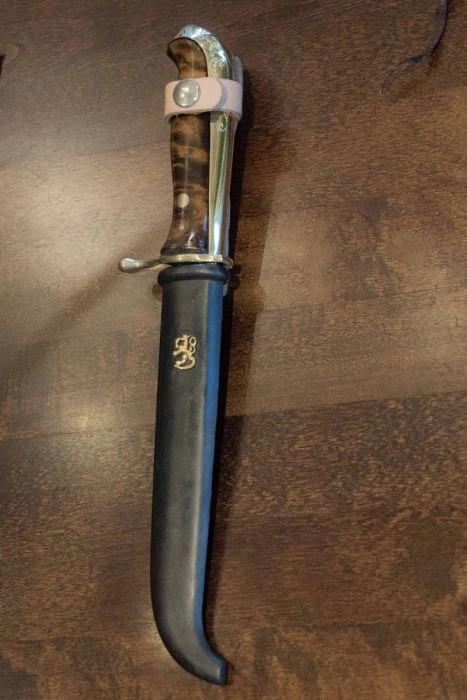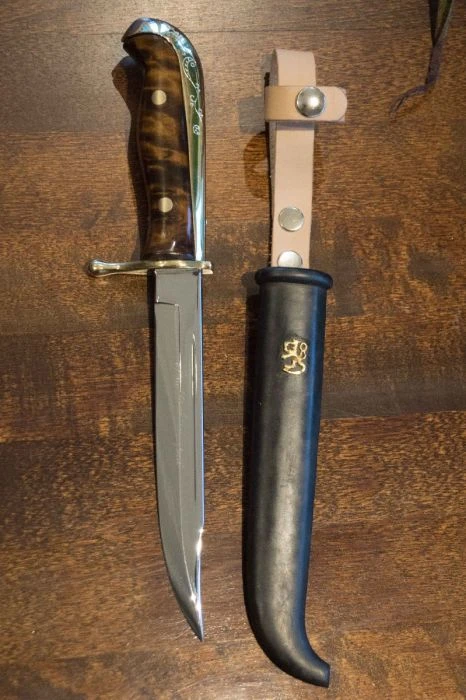 Suunnittelimme alkuperäistä kunnioittaen uuden version näistä työkaluista ja osista, ja nyt noin vuoden työstämisen jälkeen meillä on Puukkopistin M2021, jonka terä on 4 mm hiiliterästä, kahvan sivut visakoivua joka on petsattu ja lakattu. Tässä erikoismallissa sormisuoja on meillä tehtaalla valettu messingistä, samoin päähän kaartuva selkäosan hela joka on koristeltu Suomen leijonalla ja käsin kaiverretulla koristekuviolla. Tuppi on peltituppi nahkaisella kantolenkillä ja se on käsitelty sinistämällä. Tuppeen on kiinnitetty messinkinen Suomen leijona.