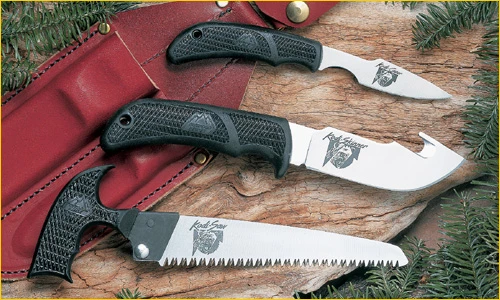 # Leather belt sheath that holds both knives and the saw