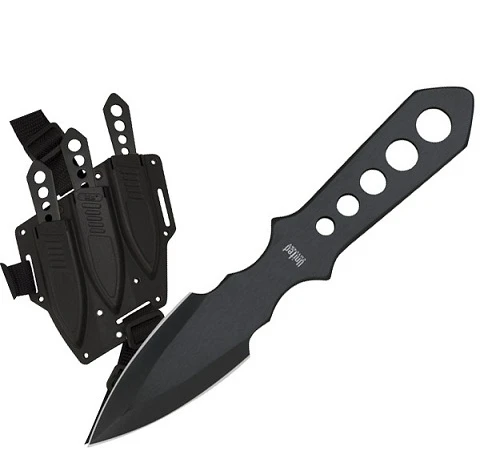This Lightning Bolt Triple Throwing knife set is the first compact, easily concealable self defense throwing knife set ever. Each of the three throwing knives is black-coated for a durable fiinsh and perfectly balanced for an accurate throw every time. The AUS-6 stainless steel blades are double-edged and razor-sharp so they’ll always make a deep impact on your target. Includes a hard ABS sheath that each knife locks into. The sheath can be worn on a belt or concealed using the included nylon shoulder harness.
