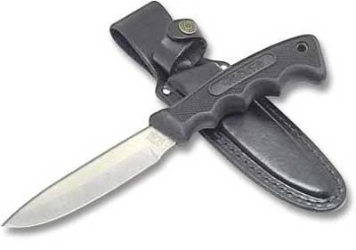 The illustrated Western Knife is the Western Hunting Knife that features a 4 3/8″ drop point blade made of 420HC high carbon stainless steel. The black no slip Kraton handle of this Western Knife has finger grooves and a lanyard hole. A black leather sheath is included with this Western Hunting Knife. The Western Hunting Knife with Drop Point blade has an overall length of 9 3/4″.